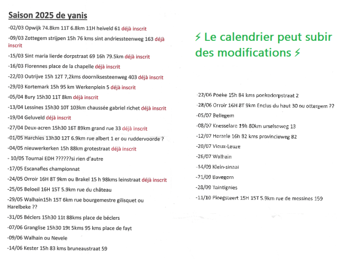 📱De Site Roger Baudechon 2025. Merci à Yanis et famille pour le dépôt du calendrier ! Pour le JUNIOR de GHOY (Lessines), la saison débute ce dimanche à OPWIJK. Mais avant cela, il a fait une bonne préparation hivernale. Des stages avec l'équipe et un voyage en Espagne. Il devrait être en forme pour sa … Lire la suite CALENDRIER DE YANIS DUBOIS. JUN 2e. 02/03.💠2025